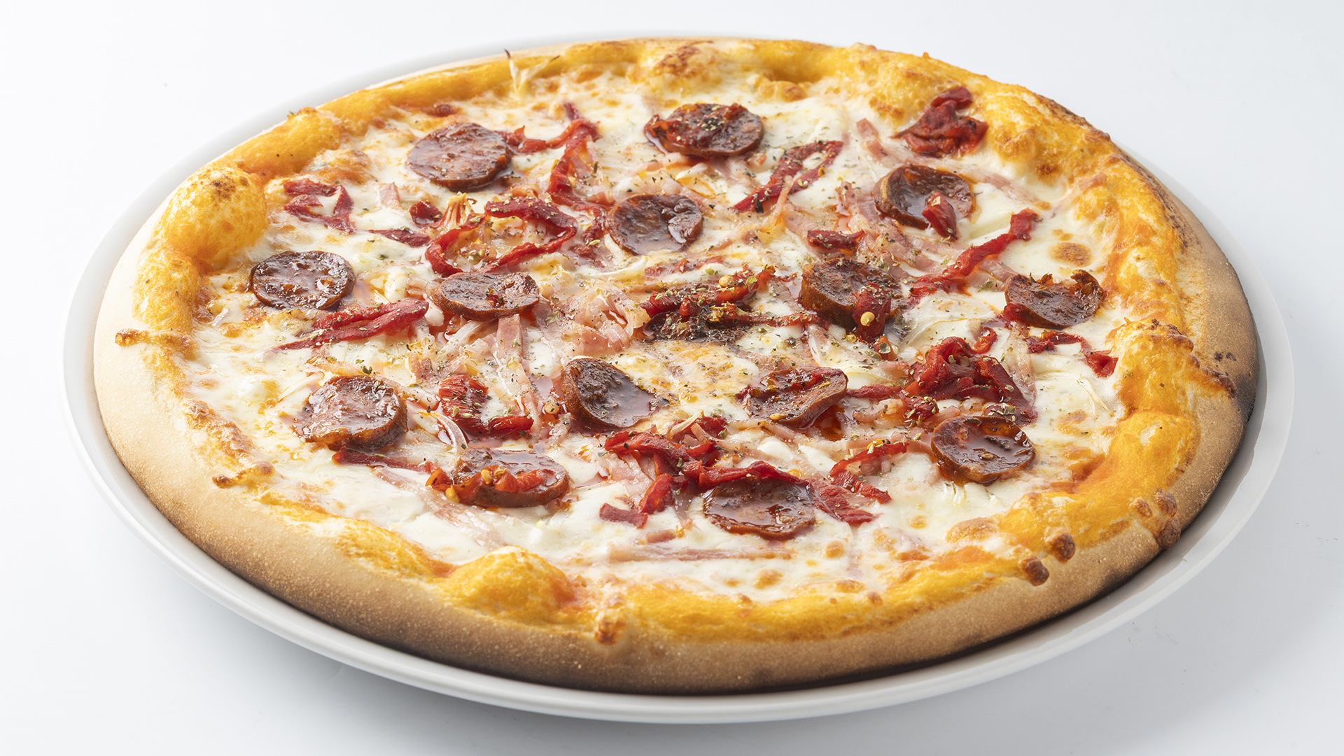 A continuación, agregamos el queso mozzarella y por encima le ponemos el bacon y la cebolla seguida del chorizo IGP y las alegrías.